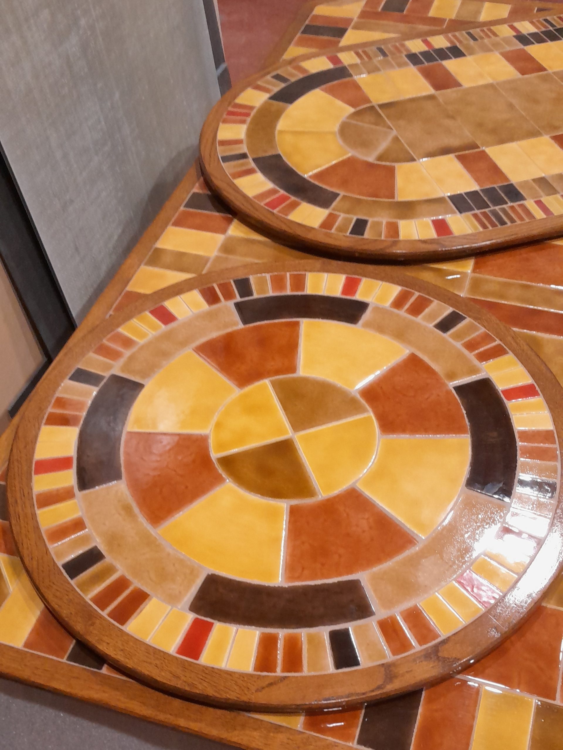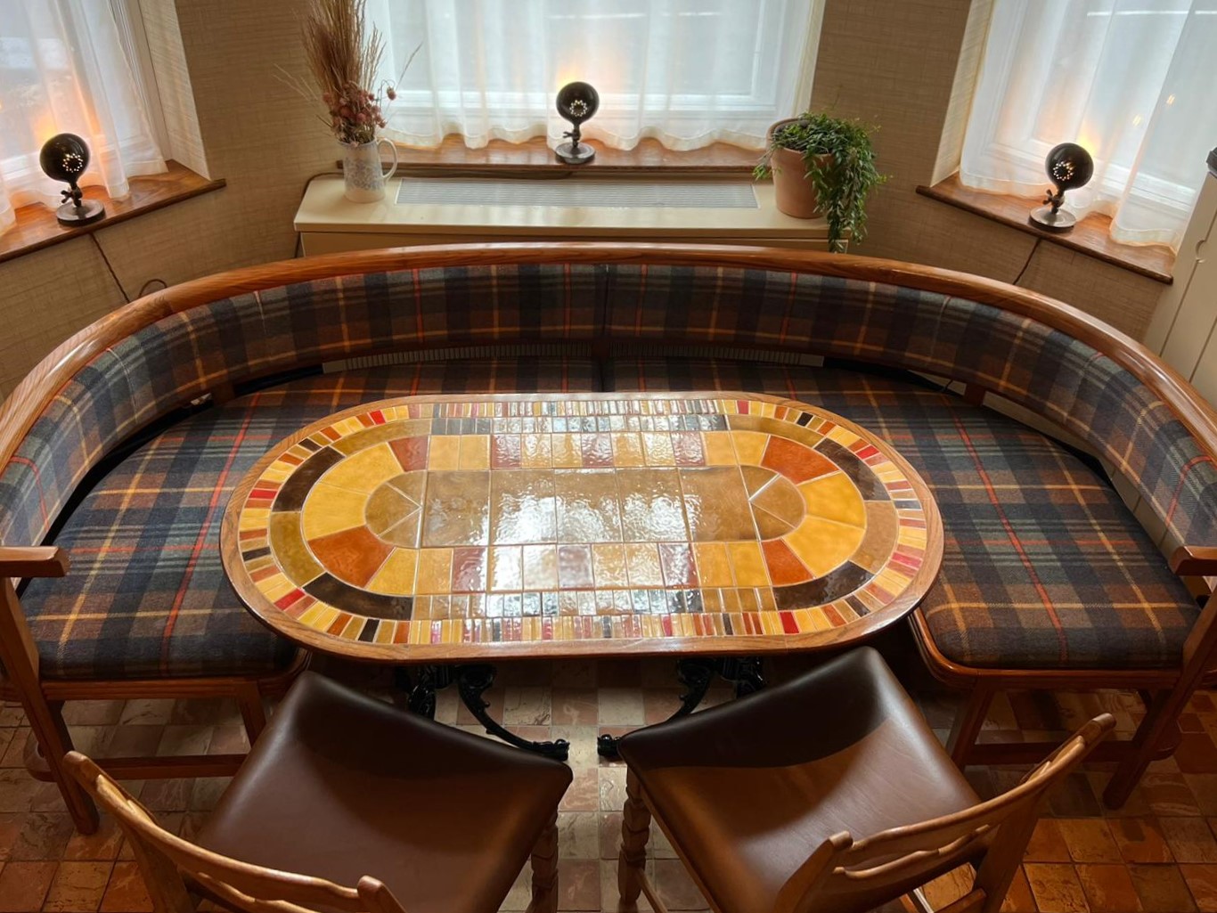 Bespoke dining chairs, dining tables, banquettes, and hand made tiled mosaic tables.