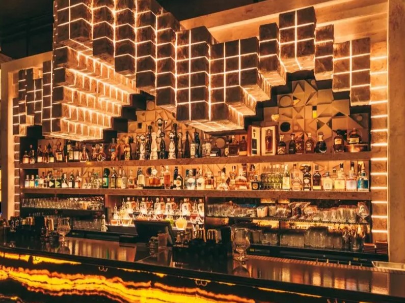 Bespoke statement wall panel delivered for a high-end restaurant and bar environment.