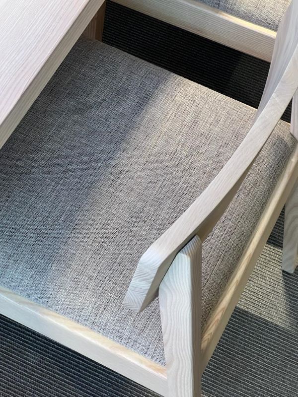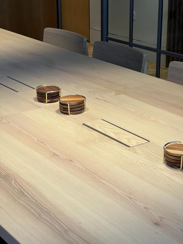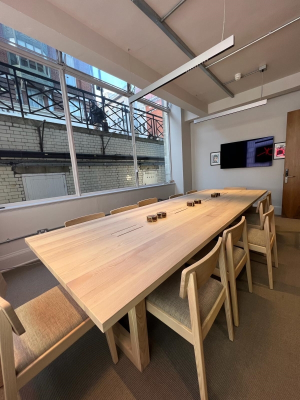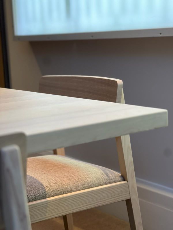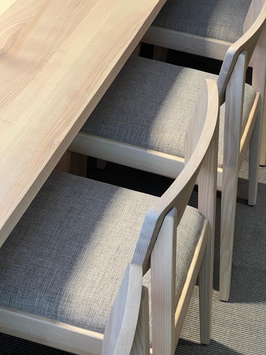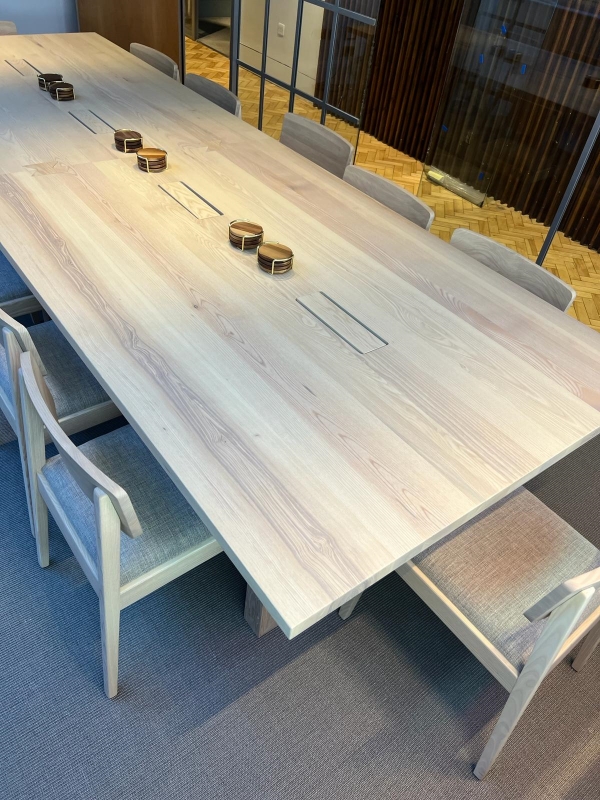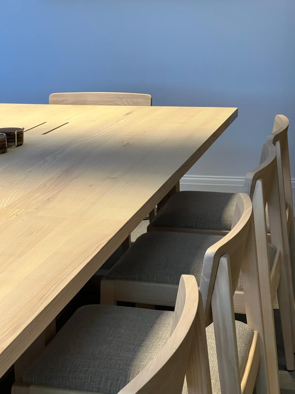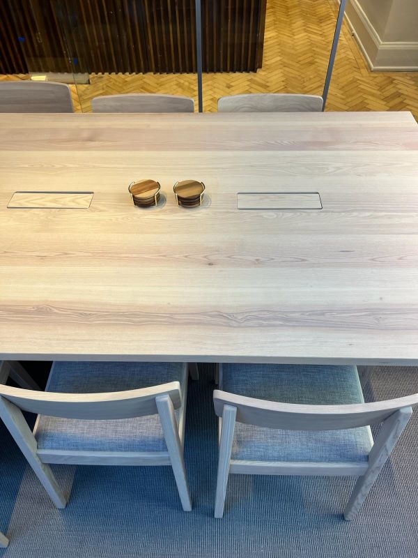 Solid timber meeting tables and accompanying chairs, ready for installation.